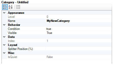 Visible: Visibility option for the category. If the Condition statement is false, this property controls whether or not the disabled category will be visible. If true, then the category will appear in a disabled state. If false, the disabled category will be invisible.
