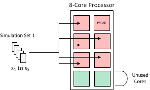 The image below illustrates a scenario on how resources are utilized when running simulations in sets. In this example, there are two sets, one containing 5 simulations, and the other 9. As the local processor is 8-core, then there are 7 cores available (one used by PSCAD) to run the processes. The second set contains more simulations than there are cores available (9 simulations, 7 cores). In these situations, the operating system will force all 9 processes to be shared amongst the available resources. Obviously, the more cores available for parallel processing, the larger the sets of simulations can be run without any impact on efficiency.