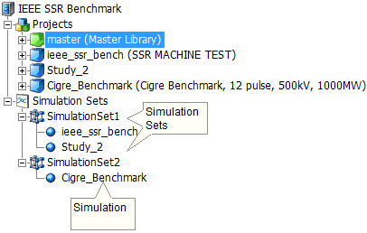 The concept of a simulation set provides the foundation for parallel computing in PSCAD. A simulation set is a container of sorts, used to compartmentalize and configure groups of simulations. All simulations placed within a particular set are launched simultaneously (in parallel), utilizing all processing resources available. If multiple simulation sets have been defined, then each set is run sequentially as they appear in the list of sets: In the image above for example, SimulationSet1 will launch and run the ieee_ssr_bench and Study_2 projects simultaneously. Once finished, SimulationSet2 will launch and run the Cigre_Benchmark project. The sequential launching of all sets is automatic, if the user selects to run all sets.