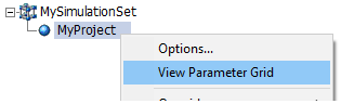 Managing simulation and simulation set options can become unruly when many simulation sets are defined in the workspace. Thankfully, the Parameter Grid may be utilized for these tasks. Simulation set options, simulation options, simulation project setting overrides, and simulation layer overrides, may all be managed through the parameter grid: