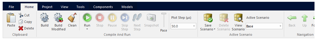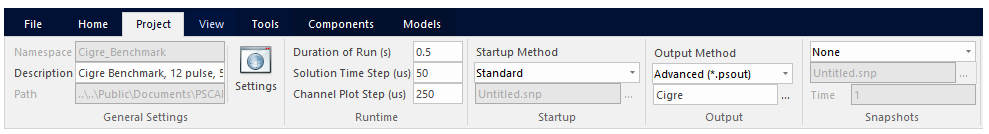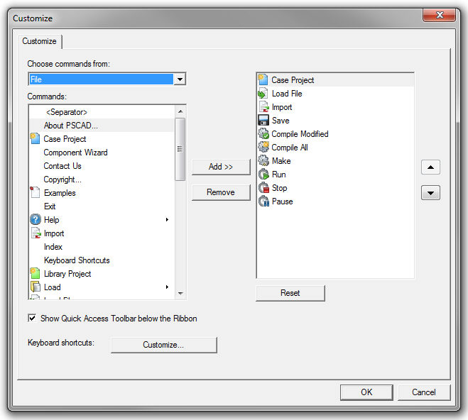 The ribbon control bar provides easy accessibility to most features and components in PSCAD. Included with the ribbon is an inherent quick access bar, which is customizable for placement of favoured and well used button actions. The ribbon control bar is featured prominently across the top of the application environment.
