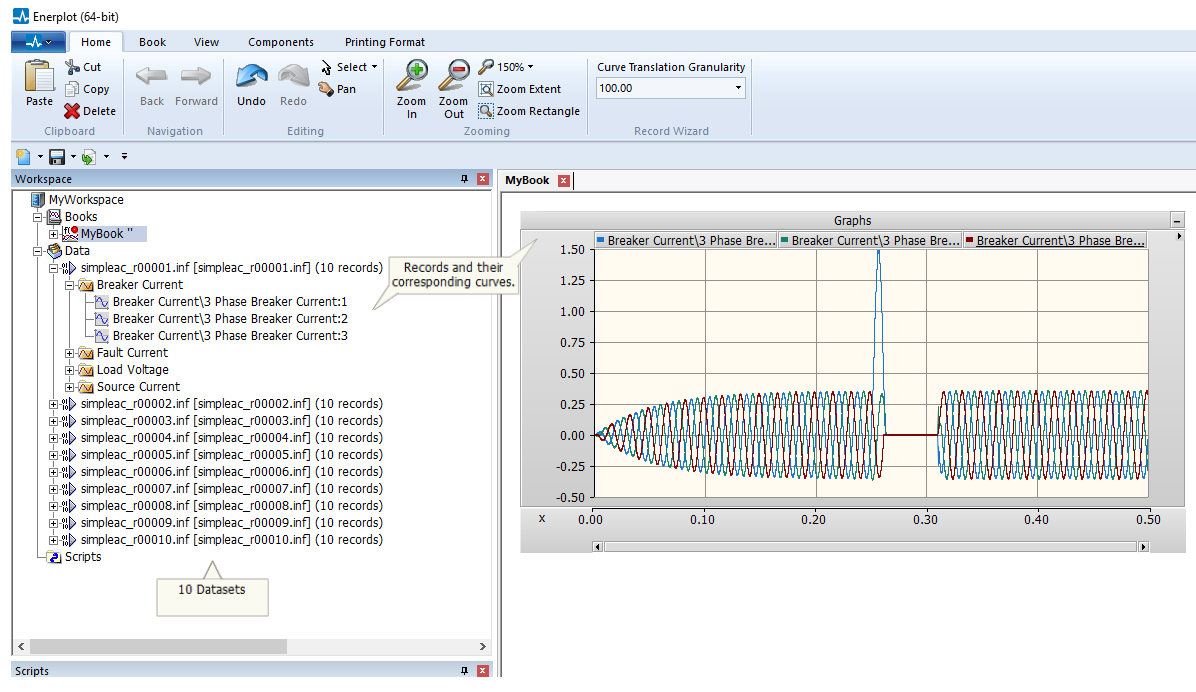 For example, say 10 simulation runs are performed resulting in 10 output files. These 10 data source files are then loaded into Enerplot (10 datasets in the Data branch). Three of the records in the first dataset are used to create three curves in the graph: