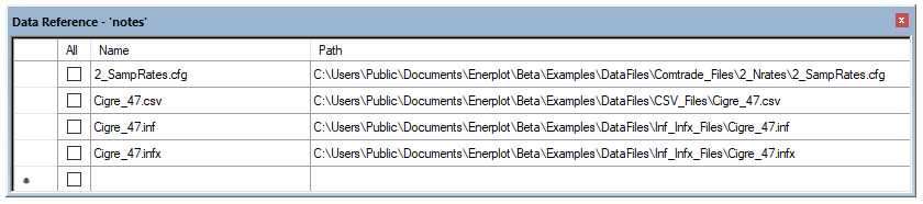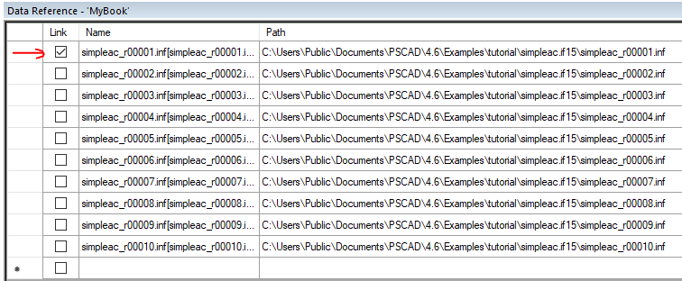 As soon as the curves were created from the records, a reference between the simpleac_r00001.inf dataset and the book called MyBook, was created. This will now be displayed in the Data Reference pane, as shown below (note the checked link box):