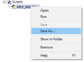 From the Script context menu in the workspace tree, select Save to save the present file, or Save As... to save the file under a new name.
