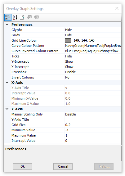 Left double-click on the desired overlay graph, or right-click on the graph and select Edit Properties.... This will bring up the Overlay Graph Settings dialog window as shown below: