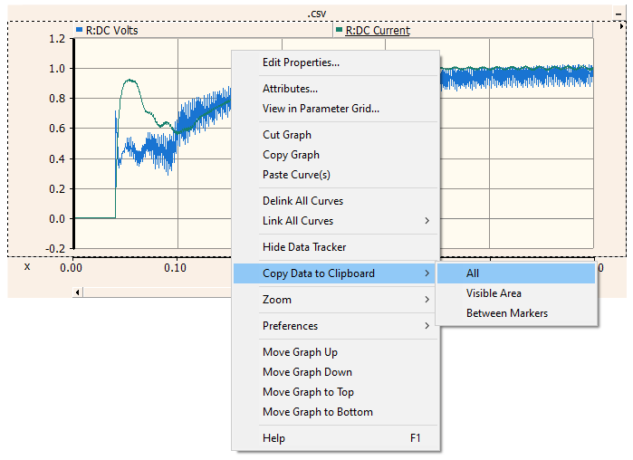 If a simulation has been run and your graph contains curve data, you have the option of copying all or a portion of all curve data to the clipboard. Right-click over the corresponding graph and select Copy Data to Clipboard and then select one of the following from the pop-up menu: