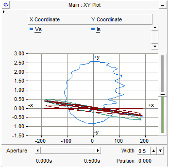 Although the xy plot is used to plot one signal versus another, each of these signals is based on the same time scale. It is therefore possible to scroll through the data in the time domain: The xy plot includes a time domain aperture control bar, located at the bottom of the plot frame.