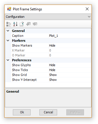 To access the Plot Frame Properties dialog, left double-click the plot title bar, or right-click over the title bar and select Plot Frame Properties.... This should bring up the Plot Frame Properties dialog window.