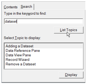 The search section allows you to enter in a single word or a text string, and then list the topics that contain the word or string. Simply enter the text string and click the List Topics button. Any topics containing the string will be displayed in the output field as shown below.
