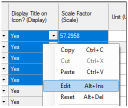 The power of the parameter grid lies in its allowance for modifying parameter values en masse. Multiple parameters (columns) and multiple object instances (rows) can be modified simultaneously by simply selecting the appropriate cells, right-click and select Edit... (or press Alt + Ins).