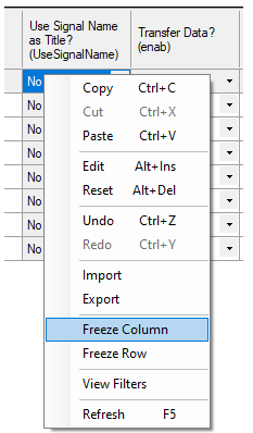 If there are an unruly amount of parameters (columns), or a large number of object instances (rows), you can select rows/columns to freeze in the parameter grid pane, so as to keep them in view while scrolling: