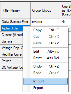 Parameter grid contents can be imported or exported to file in comma separated variable (*.csv) format. Right-click and choose either Import or Export, or click the Export or Import buttons, or: