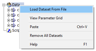 Load Dataset From File: Opens the Open Data File dialog. Select a supported data file type to load as a dataset. See Loading a Dataset for more details.