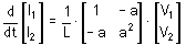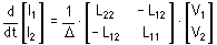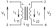 The voltage across the first winding is V1 and the voltage across the second winding is V2. The following equation describes the voltage-current relationship for the two, coupled coils: