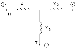 An equivalent circuit diagram of the positive sequence leakage reactances is shown in Figure 6-4. The inductances of the equivalent circuit are all based on the rated voltage of one winding, which for this example is winding 1 (the HV winding), rated at 132.79 kV (