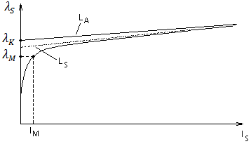 The non-linear nature of Equation 6-21 is displayed in Figure 6-6, where flux is plotted as a function of current. The air core inductance LA is represented by the straight-line characteristic, which bisects the flux axis at lK. The actual saturation characteristic is represented by LM and is asymptotic to both the vertical flux axis and the air core inductance characteristic. The sharpness of the knee point is defined by lM and IM, which can represent the peak magnetizing flux and current at rated volts. It is possible to define an asymptotic equation for current in the non-linear saturating inductance LS if LA, lK, lM, and IM are known. Current IS can be defined as: