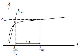 where λM and IM are the peak magnetizing flux and current at rated voltage as shown in Figure 6-6, and the nonlinear component that is the difference between the total magnetizing current and the linear current as illustrated in Figure 6-10. The nonlinear component or saturation current can be calculated as follows: