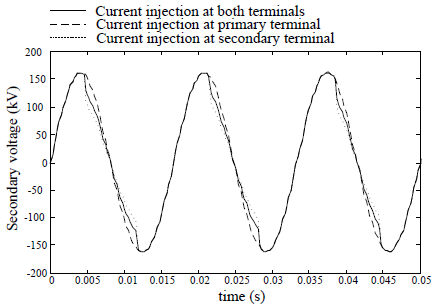 It can be observed above that when the saturation current is injected at the terminals where the source is connected, the secondary voltage waveform is not distorted since other elements modeling the transformer are linear. On the other hand, injecting the saturation current at the secondary winding increases the distortion in its voltage waveform. This phenomena is also true for three and four winding transformer models.