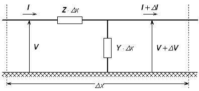Given that Z and Y are the system impedance and admittance per unit length respectively, V is the conductor voltage and I is the conductor current, then the system in Figure 8-5 is described mathematically by the telegrapher’s equations (as the limit Dxg 0):