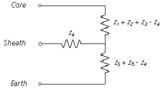 This equivalent circuit can be derived by considering the effects of two circulating currents: The first flowing down the core conductor and returning back through the sheath, and the second down the sheath and back through the surrounding media [7].