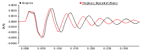 A voltage surge is applied at the sending end of the line, and the resultant sending end current is monitored. The waveform is compared to the sending end current given by the Frequency Dependent (Phase) model, which for this example is assumed to very similar to a real world result.