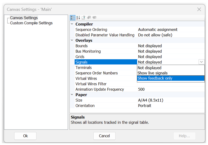 When a project is imported into PSCAD v5.1.0, it is scanned for disabled module parameters. If encountered, the above dialog is presented on a per project basis. Please take care in selecting one of the three options provided. If you need to go back and change the settings after import, it may be done on a per module basis, via the canvas settings: