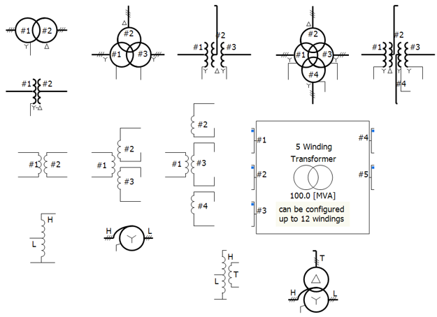 1-Phase, Multi-Winding (5-12), Transformer: This component models a single-phase, ideal transformer that can be configured to model from five to 12 windings. Options are provided to enable a simple saturation model on a user selected winding, as well as for adding a tap changer.