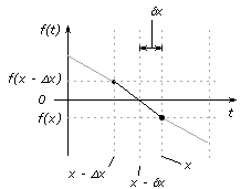 Assuming a linear segment between time steps t = x – Dx and t = x, the exact time at which the function f(t) crosses zero would be at t = x – Dx. Referring to the above figure, the interpolated time dx can then be calculated using a simple linear ratio as follows: