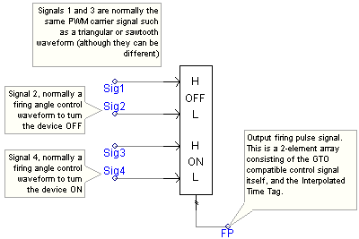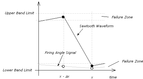 Anyone familiar with simulating comparison type control systems (such as PWM) will recognize that, when performing comparisons of two signals, care must be exercised to prevent signal failure at the signal extremities. For example, consider the case when comparing a 0 to 360° sawtooth waveform with a firing angle signal in order to create a thyristor gate control. Depending on the time step Dt, the frequency f and the amplitude A of the sawtooth, there is a ’r;failure zone’ created.