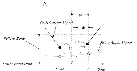 Since the slope of both the PWM Carrier Signal (mPWM) and the Firing Angle Signal (mfa) are both known, the exact time at which the discontinuity should occur (zx) can be calculated. Once this quantity is known, then the Interpolated Time Tag (dx) can be calculated (as shown above for proximity to lower band limit). This in turn ensures that: 1) the situation is detected and 2) the exact time a switch should have occurred is known.