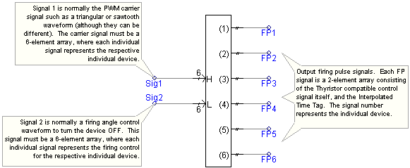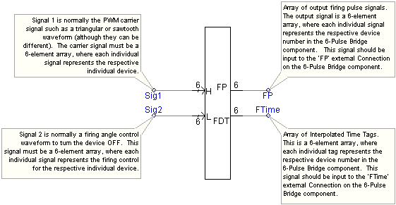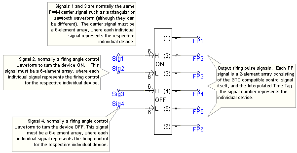 There are a few types of output format configurations available in this component. This depends on the type of device being controlled (i.e. individual or six Thyristors, GTO/IGBTs or the 6-Pulse Bridge component). The following illustrates set-ups for most configurations: