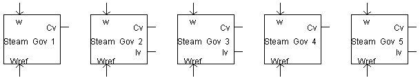 The inputs to this component are per-unit speed w, per-unit speed reference Wref. The output is the gate position z. The outputs are the control valve flow area Cv and on GOV2, 3 and 5, the intercept valve flow area Iv. Both of these outputs should be input to a corresponding Thermal Turbine.