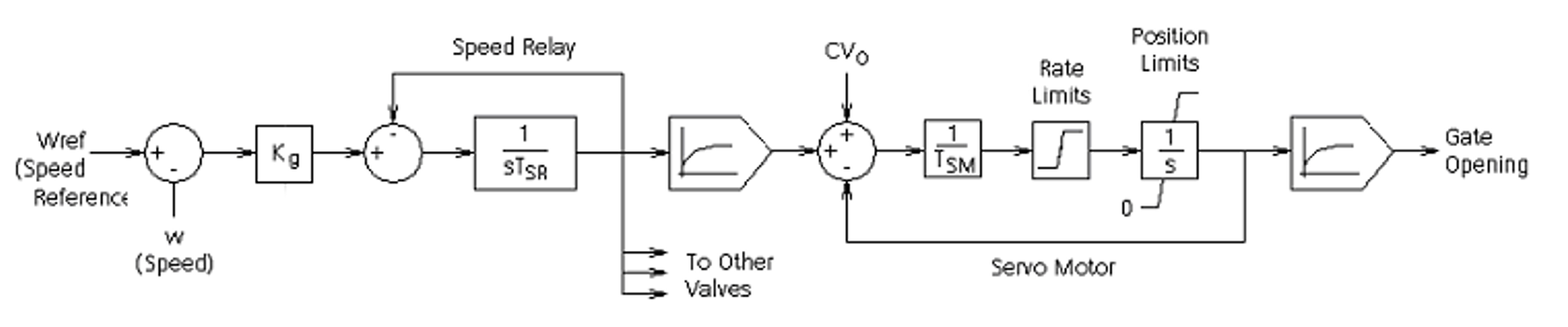NOTE: The speed relay feedback loop is implemented using a single real pole in order to eliminate the one time step delay of such a loop in the discrete time solution. Also, the non-linearities of the cam and the valve are ignored in the model.