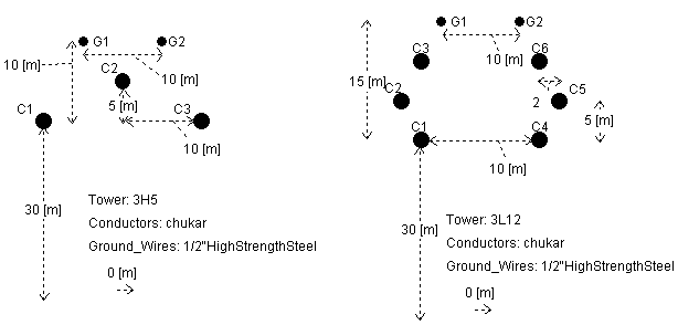 PSCAD contains a variety of pre-constructed transmission line towers (two of them are shown above). The tower components are used to define the geometric configuration of the transmission line system within the Transmission Segment Definition Editor.