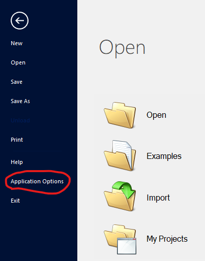 For Application Options, click on the File tab in the ribbon and then press the corresponding button (Options). |