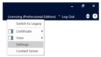 For Licensing Options, click on the Licensing menu in the top-right corner of the application, and select Settings. |