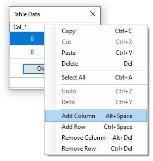You may add or remove columns and rows via the context menu. Right-click anywhere on the table field viewer and select your desired action: