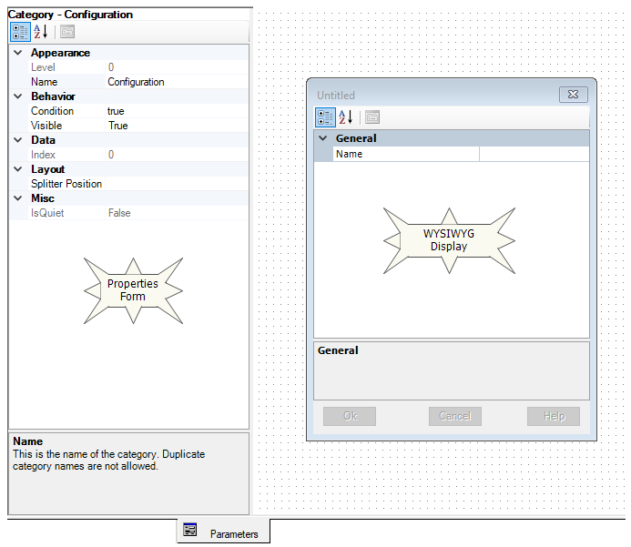 The parameter section is a WYSIWYG environment. So what you see while you are designing the component categories, is how they will appear when invoked by the user. The parameter section for a new component will initially appear as follows, with two primary objects: The Properties Form and the WYSIWYG Display.