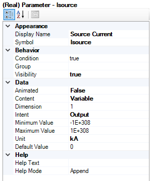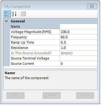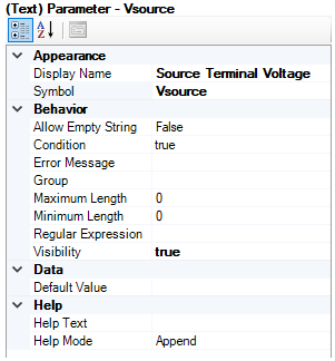 Any text field with a Symbol name identical to those defined above (i.e. Isource and Vsource), will act as internal output variable ports for the component. Any variable name entered into either the Source Current or Source Terminal Voltage text fields will create signals which, when connected to an Output Channel, can be plotted.