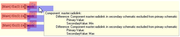 When differences are detected, they are displayed in both the Schematic view and in the Comparison Tool Results pane. In the Schematic view, color-coded shading is applied to areas where differences are detected. For example: