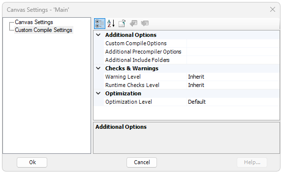 A dialog window entitled Custom Compile Settings will open when the category is left-clicked, as shown below: