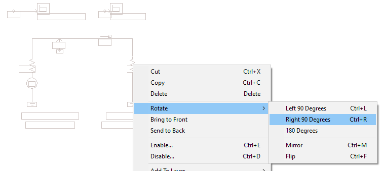 Right-Click Menu: Right-click over the object and select Rotate or Flip. Select the desired option from the resulting sub-menu.