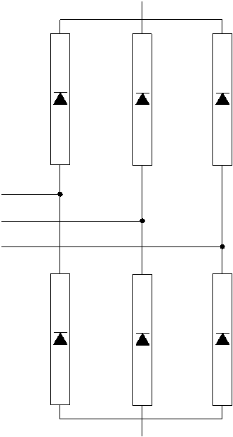 Let us conceptually build a three-phase bridge from scratch, using only module components: The most elemental (i.e. indivisible) component of the converter is the individual thyristor valves (ignoring the snubber circuits). This is where we should start the design. In practice, thyristor valves are combined in series to form a valve group. The valve group will be our first module component, where the canvas of the valve group definition consists of a string of series-connected, non-module thyristor components. The module component will also require a graphic to represent the string of thyristors when the component is placed on the canvas of its parent module.