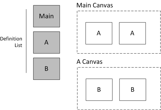 In the above example, there are two module definitions (one for Main and one for A). What would happen then if A was instantiated again so that there are two instances of it on the Main canvas? Well a new definition is not required; only an additional call statement to A within the Main subroutine is needed.