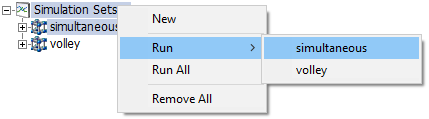 - Right-click on the Simulation Sets branch and select Run, then select the name of a defined simulation set.