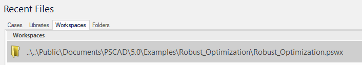 PSCAD maintains a list of workspaces, projects and folders recently used. To open a workspace file that was previously opened, click the Workspaces tab in the Recent Files area.