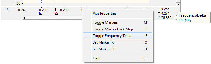 Once the markers are enabled, you can conveniently invert the time axis difference between them to display corresponding frequency. Left double-click the graph frame horizontal axis, or right-click over the horizontal axis and select Toggle Frequency/Delta (or press the F key on your keyboard):