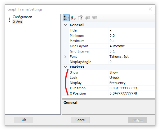 When using graph frames, left double-click the frame horizontal axis, or right-click over the horizontal axis and select Axis Properties... to bring up the Graph Frame Settings dialog. Select the Show within the Markers group and then set the x-axis values of each marker directly in the input fields provided. Note that it is also possible to directly set the frequency (i.e. 1/Delta) between the two markers.