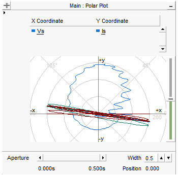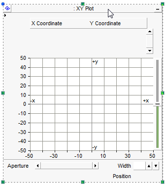 Although the xy plot is used to plot one signal versus another, each of these signals is based on the same time scale. It is therefore possible to scroll through the data in the time domain: The xy plot includes a time domain aperture control bar, located at the bottom of the plot frame.
