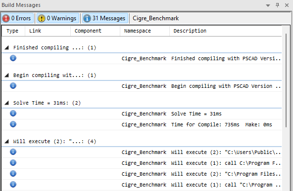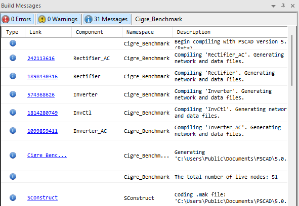 Build messages are errors and warnings related to the compilation and building of FORTRAN, data and map files for the project. PSCAD has the capability of detecting a number of different types of system inconsistencies related to this. See Error and Warning Messages for more information. Note that any warning or error messages defined in the Checks segment of any component definition will be displayed as a build message.